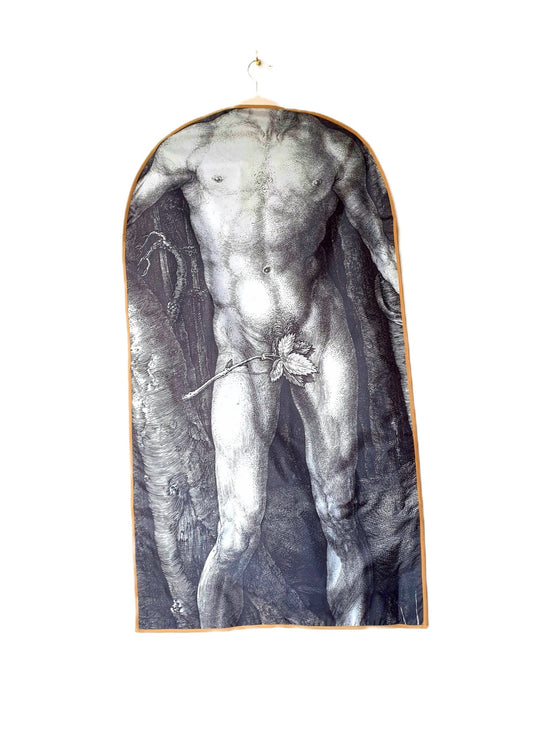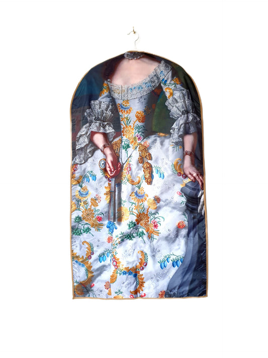 The first pieces were created intuitively, from silk, featuring prints of fine art masterpieces. In 2019, a series of artifacts was created for the Rijksmuseum competition in Amsterdam: garment covers with regal portraits by Rembrandt and Dürer, and transparent tote bags with Dutch still lifes.